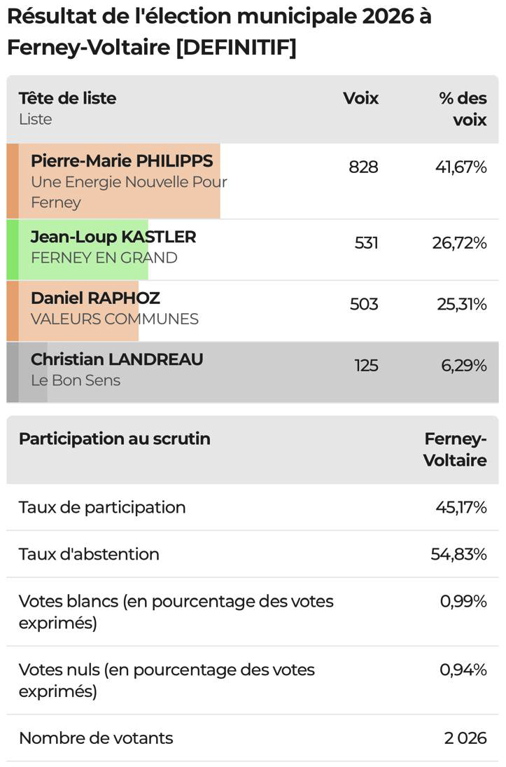 Rien n’est joué pour autant. Il reste un seul concurrent, et le second tour de dimanche 22 mars sera décisif pour l’avenir de Ferney-Voltaire. Depuis le début, nous menons une campagne claire, digne et ancrée dans la vie locale. Notre équipe rassemble des femmes et des hommes issus d’horizons variés, disponibles, proches du terrain, qui veulent agir ensemble avec sérieux, simplicité et respect.